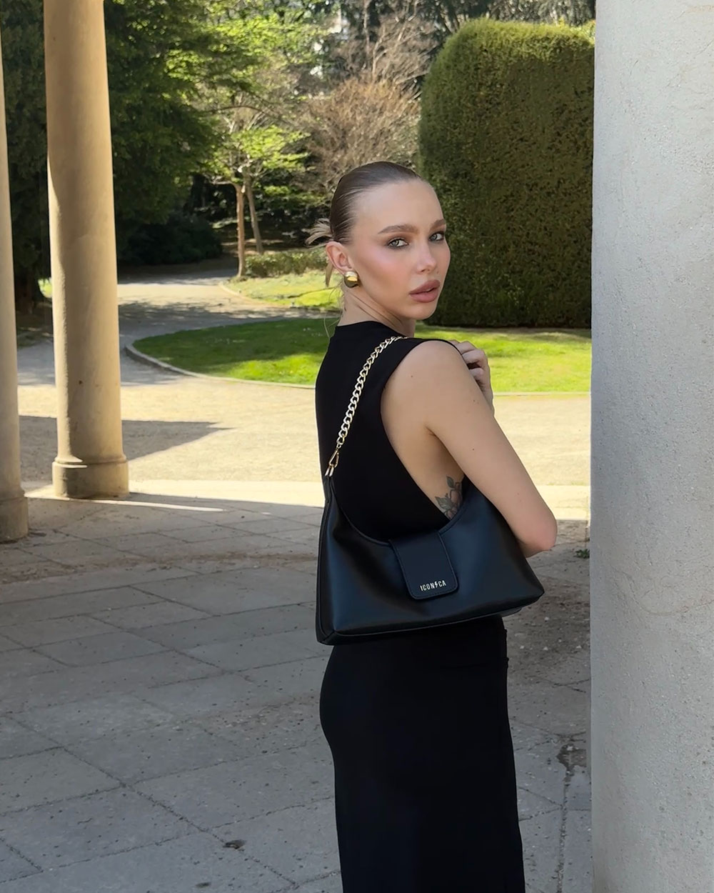 Il nero abbinato ai dettagli gold la rende elegante, d’impatto e facilissima da abbinare. Un modello versatile ma con personalità, perfetto per completare sia outfit essenziali che look più curati.