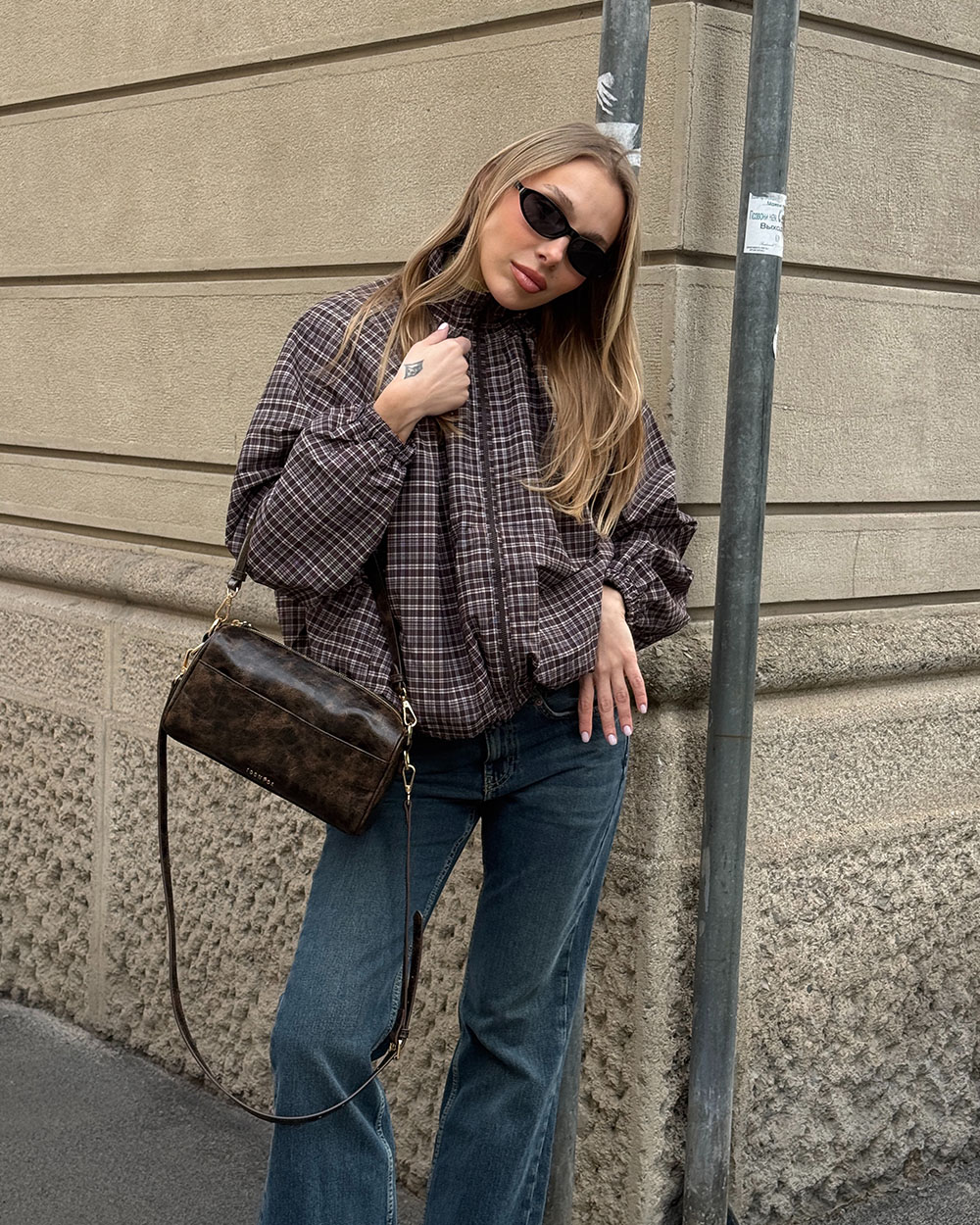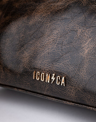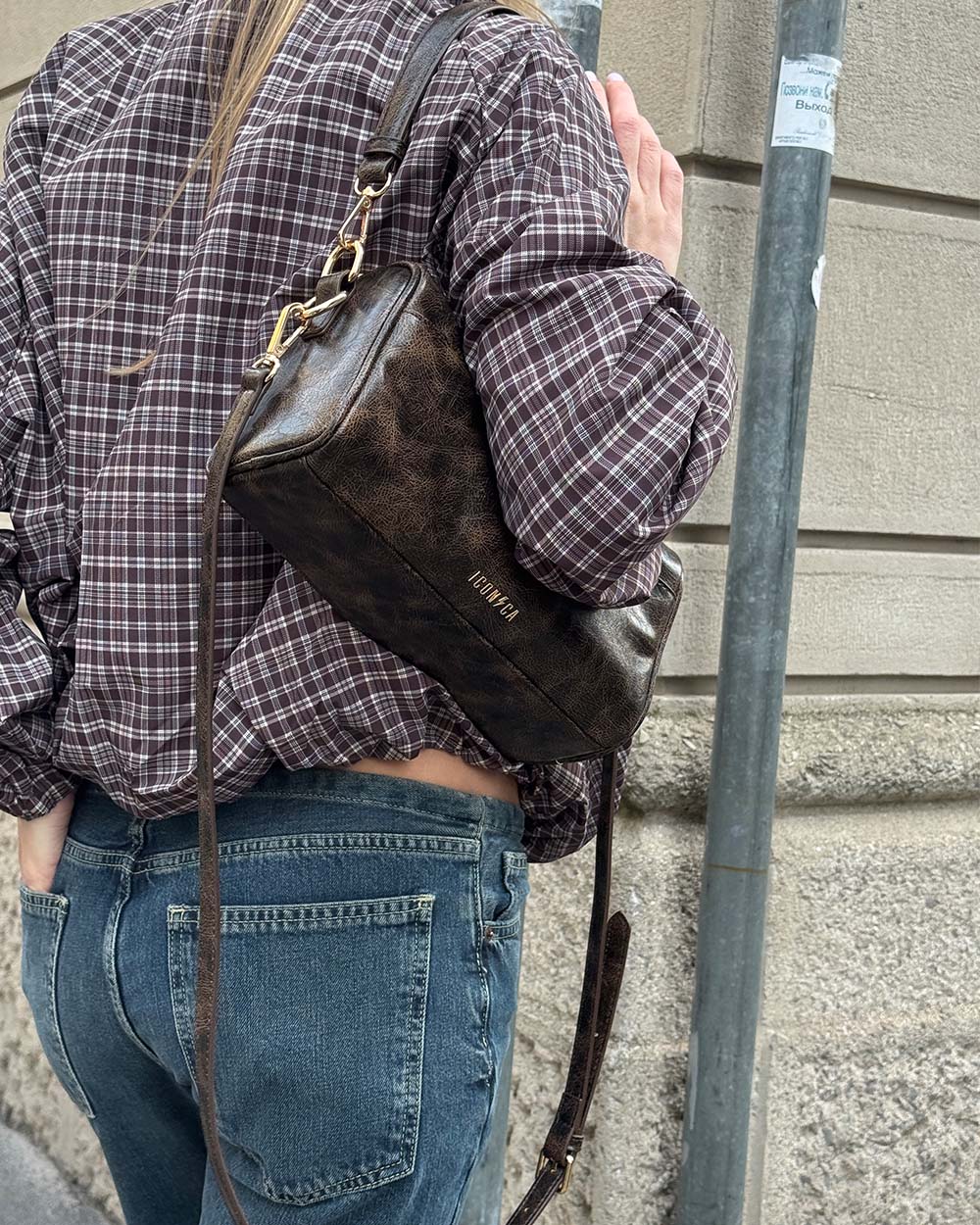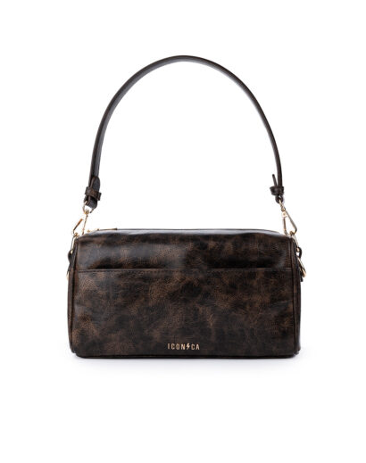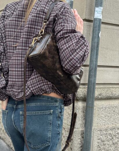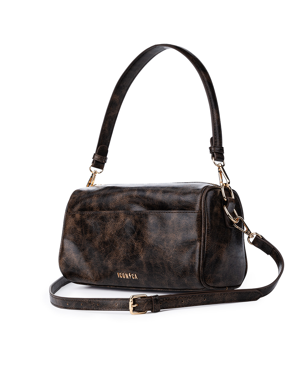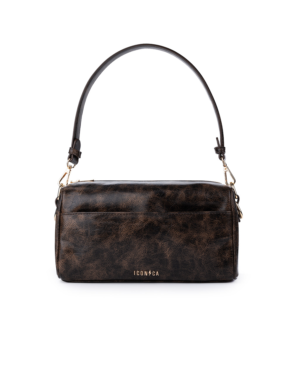 La silhouette strutturata, il finish effetto vintage e gli inserti dorati si incontrano in un equilibrio raffinato, capace di valorizzare il look con carattere e discrezione.
