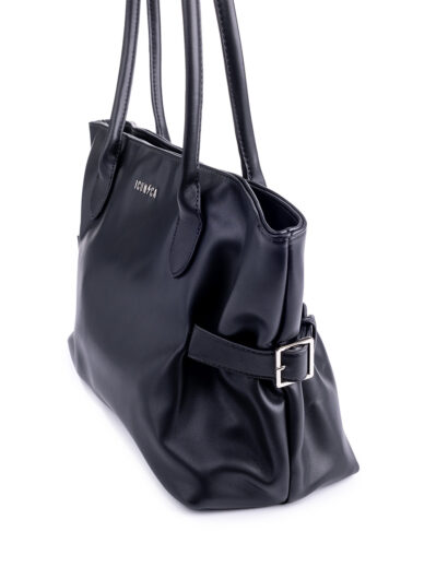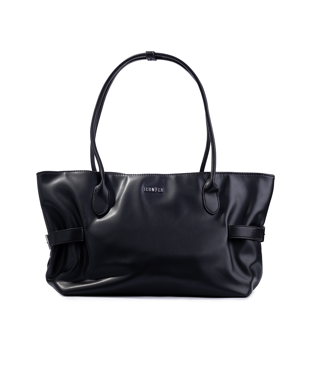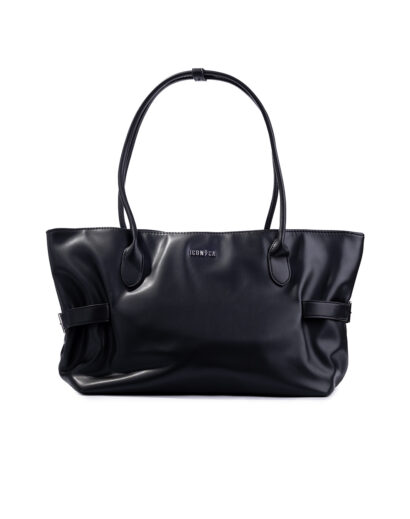 Il nero effetto pelle esalta la silhouette strutturata della Soho Bag, mentre i dettagli argentati aggiungono un tocco moderno e grafico.