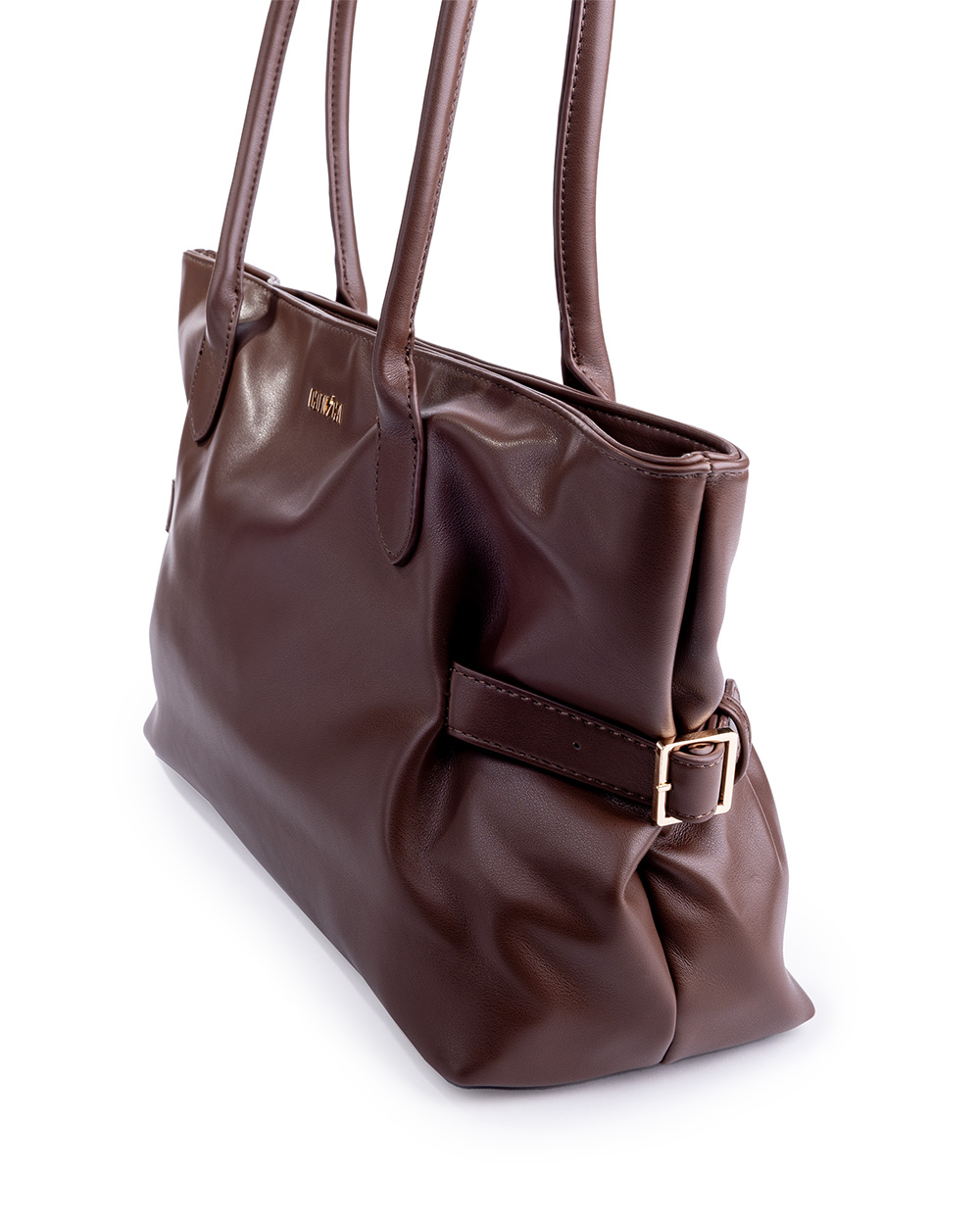 L’effetto pelle esalta la profondità del marrone, mentre i dettagli dorati donano luce e personalità al design.