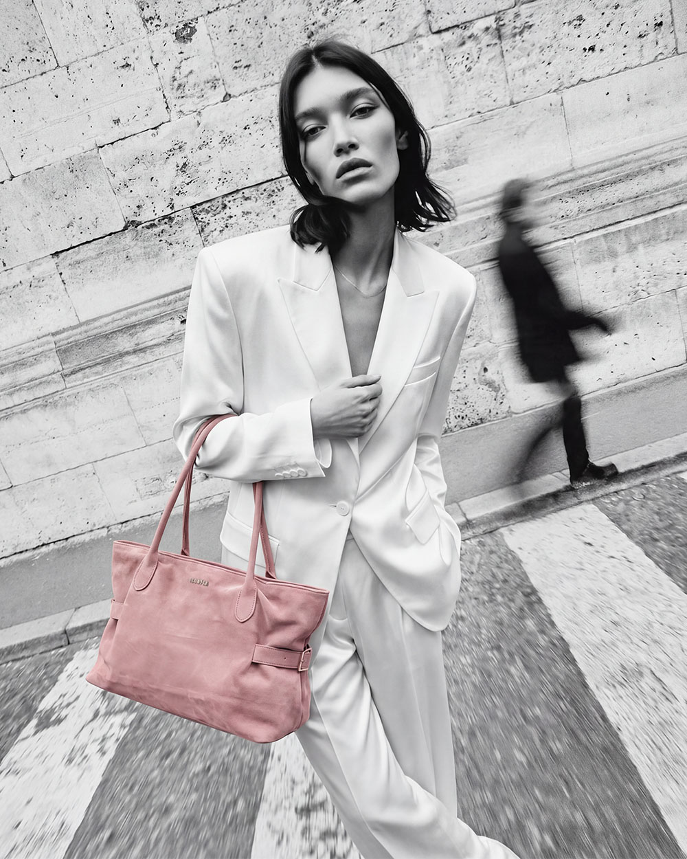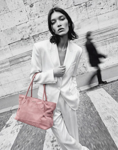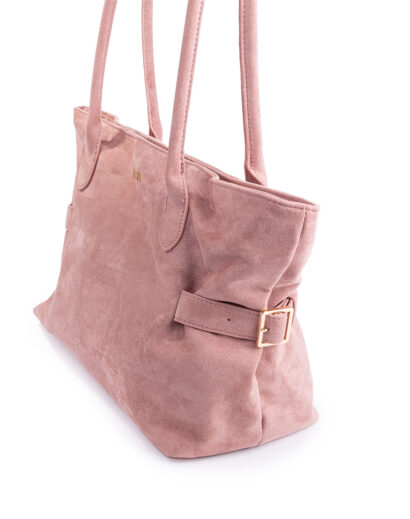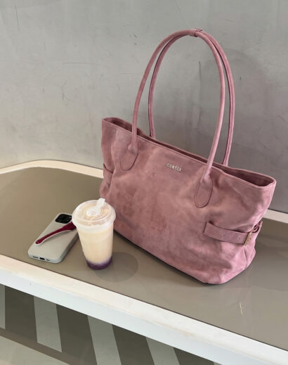La tonalità pink bloom, calda e luminosa, dona un tocco fresh e femminile al look, mentre la texture effetto suede crea un effetto vellutato che cambia con la luce. I manici lunghi tono su tono assicurano una portabilità comoda, perfetta per un utilizzo quotidiano.