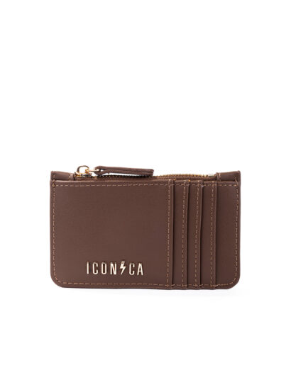 Dotato di zip superiore, scomparti per carte e logo frontale in metallo.